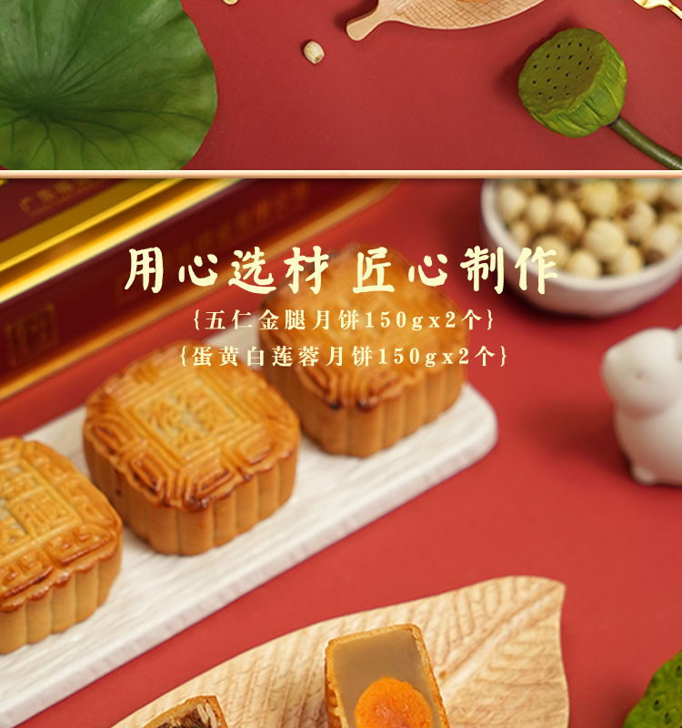 规格:150克五仁金腿月饼x2(铁盒)150克蛋黄白莲蓉月饼x2